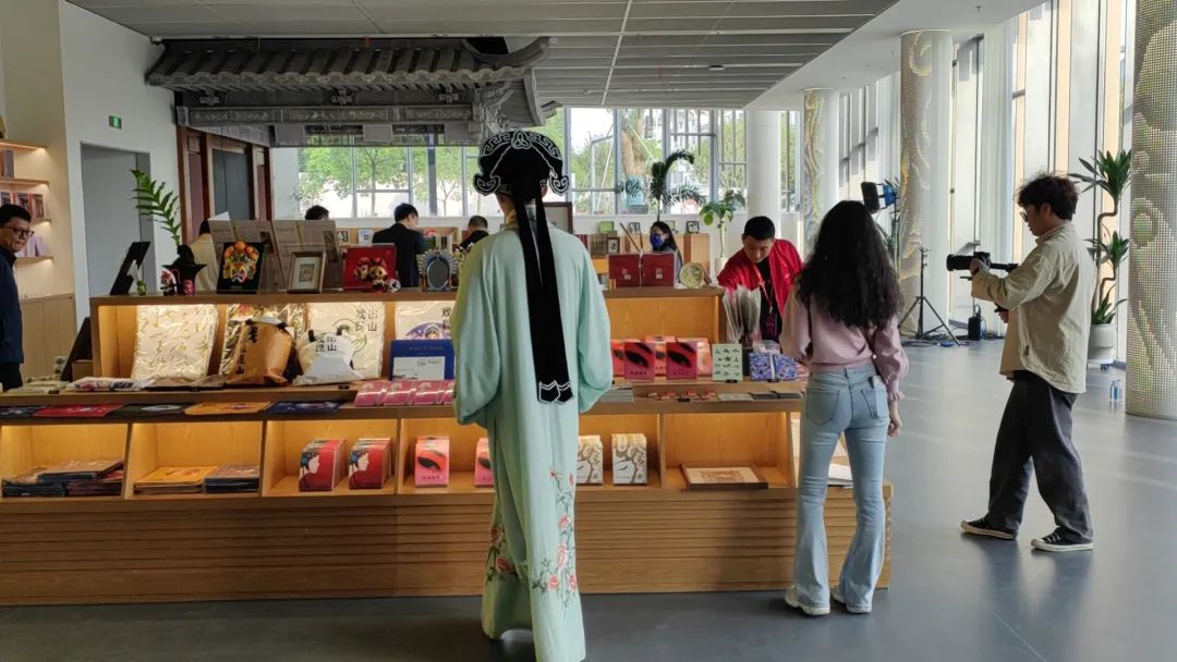 進(jìn)入戲曲百戲博物館正門,向右拐便進(jìn)入百花書局的展廳。偌大的展廳內(nèi),無(wú)處不在的戲曲臉譜、琳瑯滿目的文創(chuàng)產(chǎn)品、中西交雜的經(jīng)典唱片、造型別致的沉浸式戲臺(tái)……