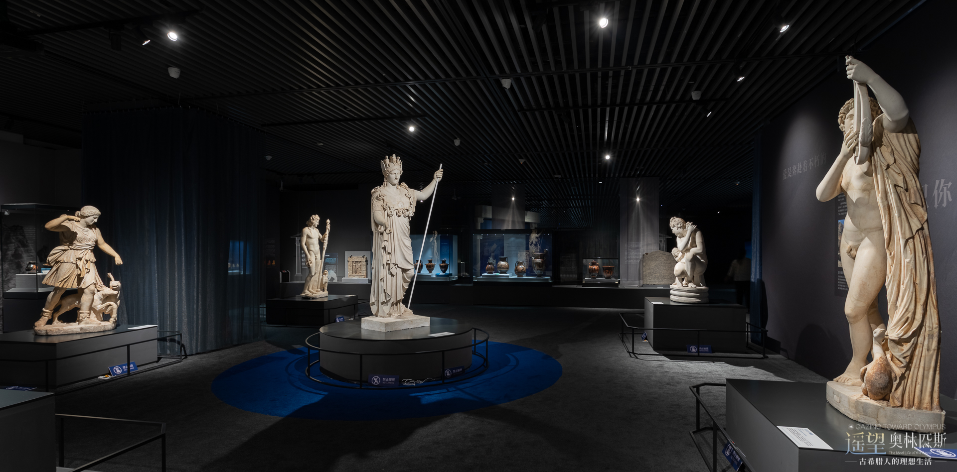 本次展覽的主題色使用地中海藍(lán),使觀眾感受到愛琴海的浪漫與夢(mèng)幻,展廳內(nèi)采用深色墻面,與眾神雕像形成強(qiáng)烈的視覺對(duì)比,結(jié)合燈光的設(shè)計(jì),營(yíng)造了神秘而莊重的觀展氛圍。