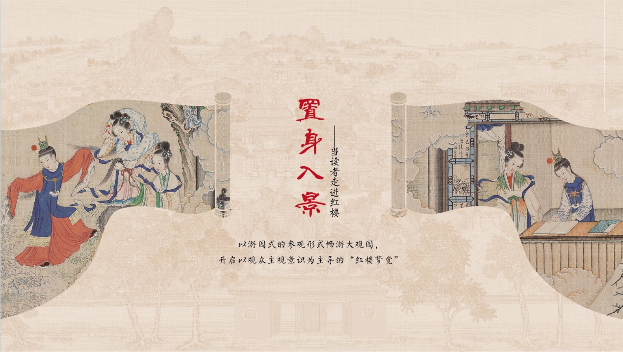展廳通過大畫面、造景裝置作為大型可進入性的“游園”結構,使觀眾可以游園式地以圖“讀”紅樓小說故事。
